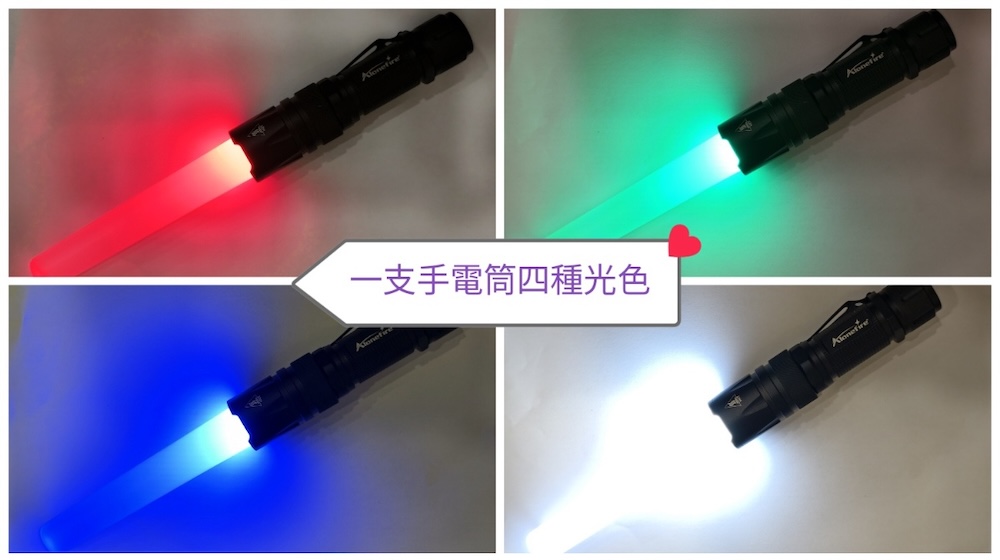 一支手電筒四種顏色 - 白藍綠紅四色切換,適合產品檢驗,演唱會,交通與保全指揮,學校混光實驗, 支援18650或AAA電池