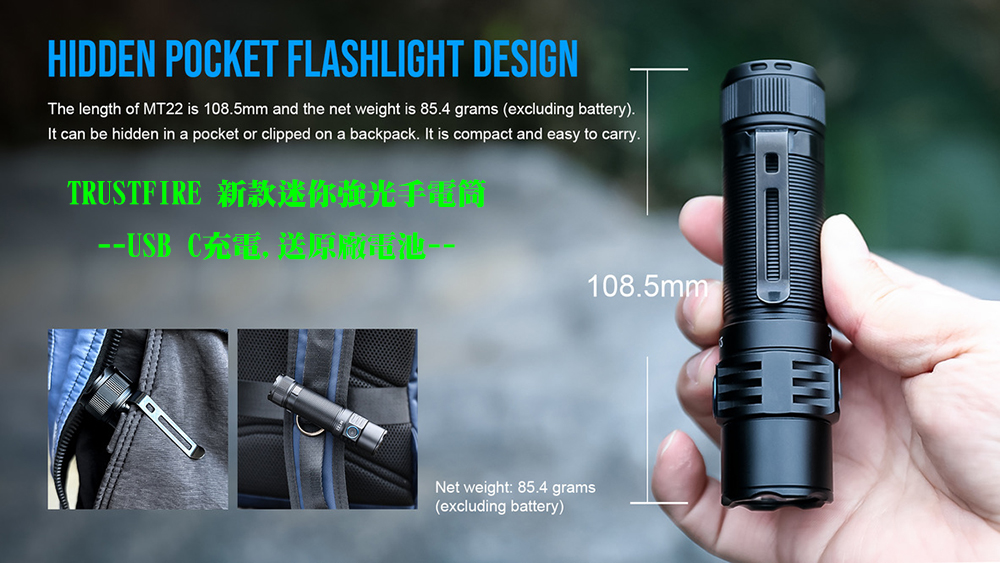 強力推薦-2250 流明-熱銷歐洲 TrustFire MT22 手電筒,送18650電池,Type C 充電, 尾部磁鐵